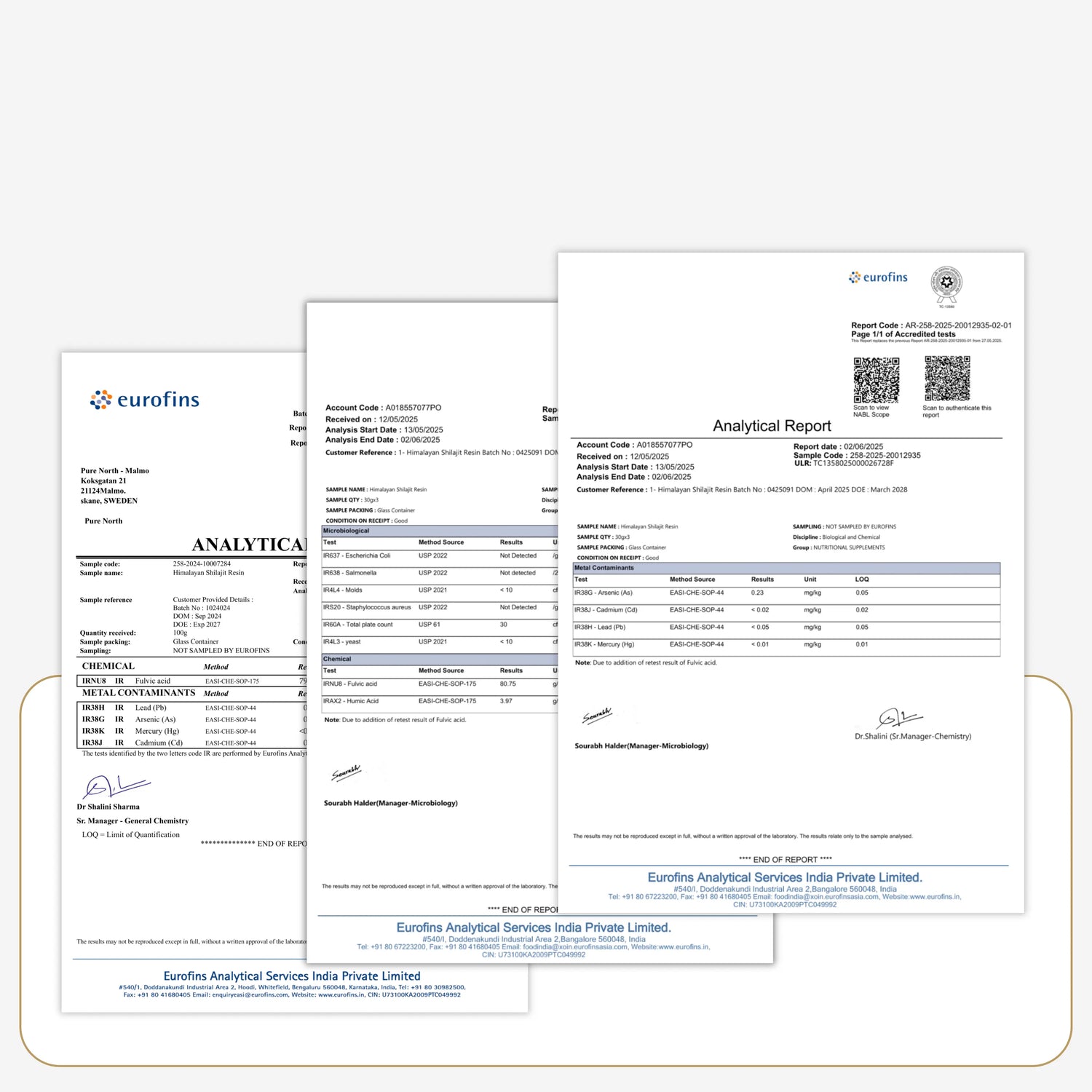 Labbtesterna på vår Shilajit är utförda av Eurofins som är en av världens största laboratoriegrupper inom kemiska och mikrobiologiska analyser.